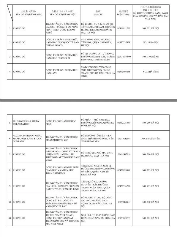 Trong số 11 cơ sở này có 3 cơ sở du học đặt văn phòng, trụ sở tại các tỉnh, gồm:
