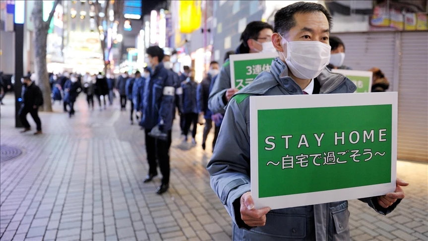 Quan chức TP Tokyo (Nhật Bản) cầm biểu ngữ yêu cầu người dân ở nhà để hạn chế sự lây lan của dịch bệnh. Ảnh: AA
