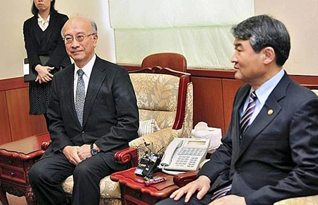 Thứ trưởng Ngoại giao Hàn Quốc Cho Tae-yong (phải) và Đại sứ Nhật Koro Bessho ngày 4-4. Ảnh: REUTERS