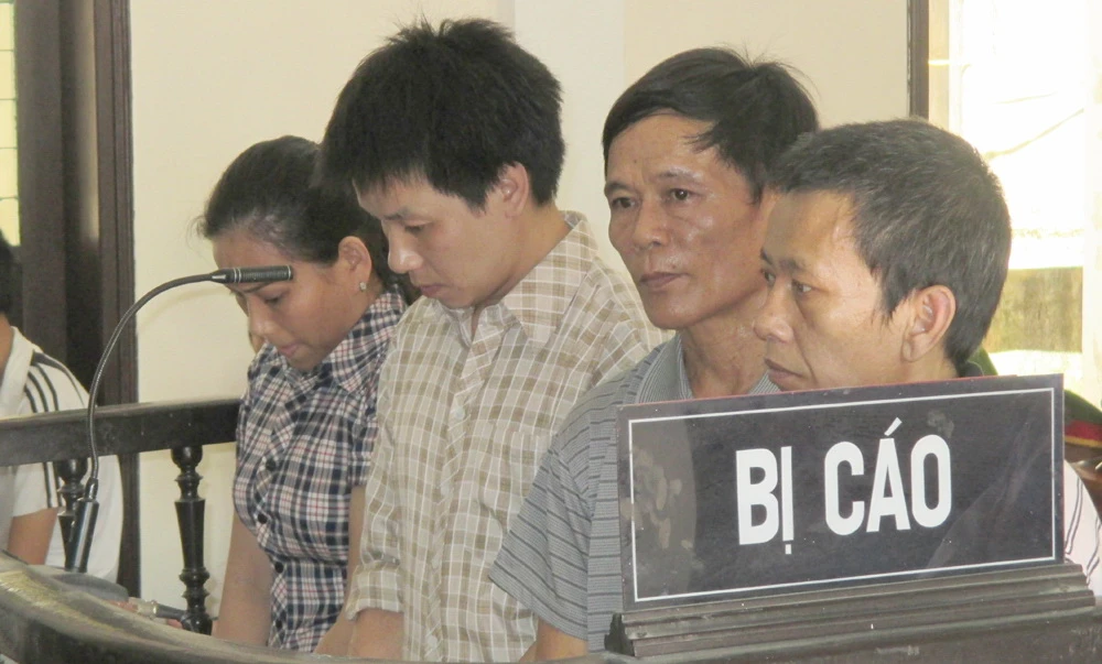 Vợ chồng Lê Doãn Chính và Dương Thị Bé Lan cùng các bị cáo đứng trước vành móng ngựa. Ảnh: Đắc Lam.