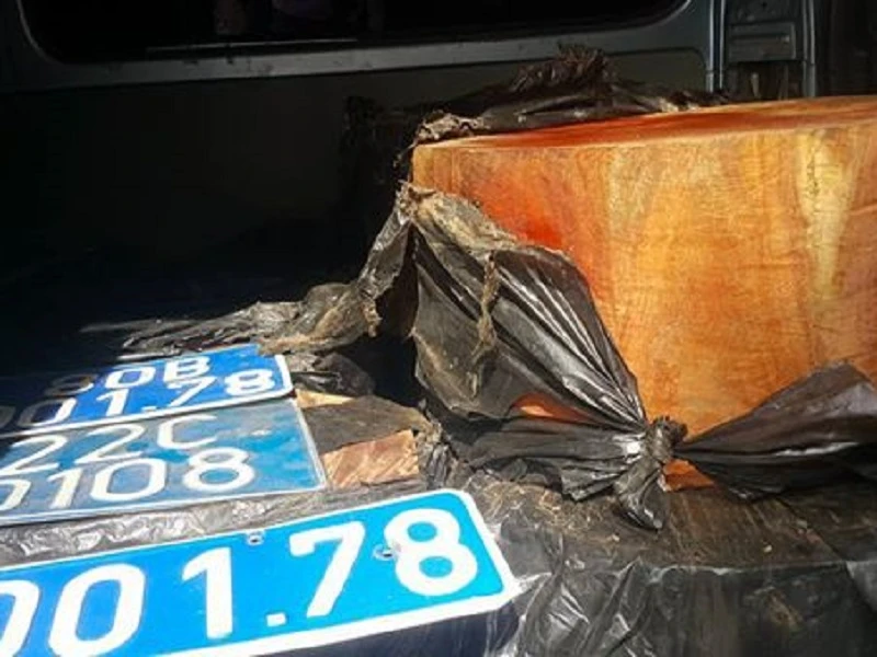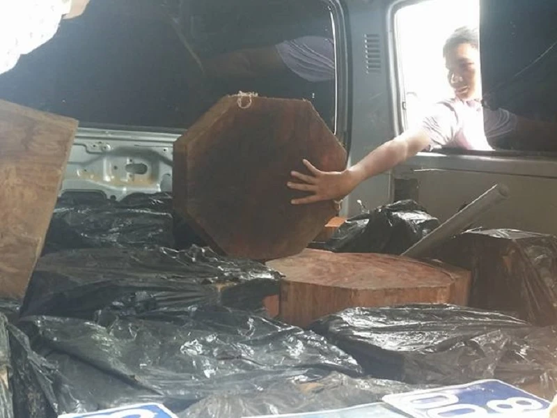 Tại thời điểm kiểm tra, lực lượng CSGT phát hiện kính trước của chiếc xe bị vỡ, xe hết thời hạn đăng kiểm; tiếp tục kiểm tra bên trong, CSGT phát hiện rất nhiều khối gỗ tròn (đường kính 55 cm, dày 20-30 cm) và trên xe có một số biển xanh khác.