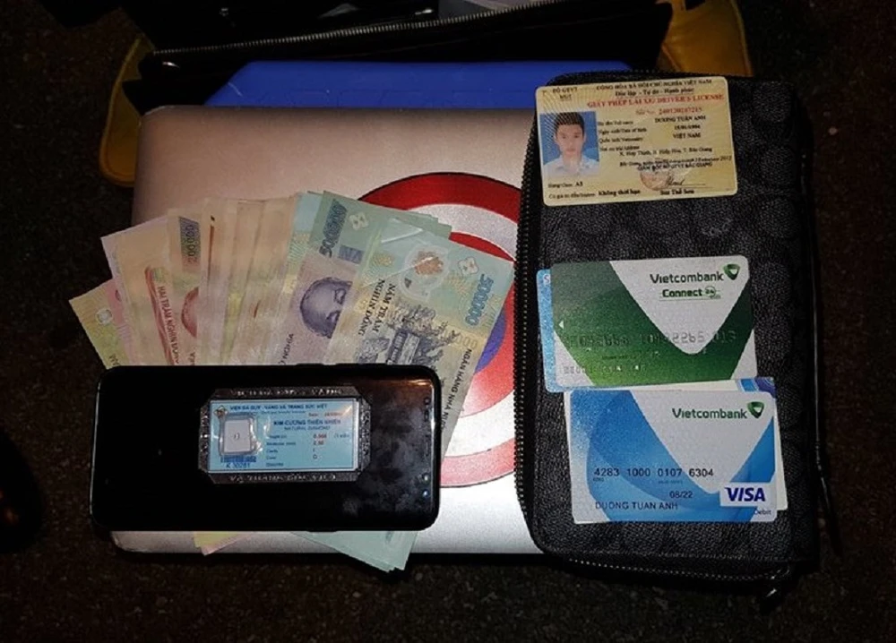 Qua kiểm tra cùng các nhân chứng, tổ công tác thấy trong cặp chứa nhiều tiền mặt, một chiếc điện thoại Samsung S8, máy tính Macbook và đặc biệt có một viên kim cương.