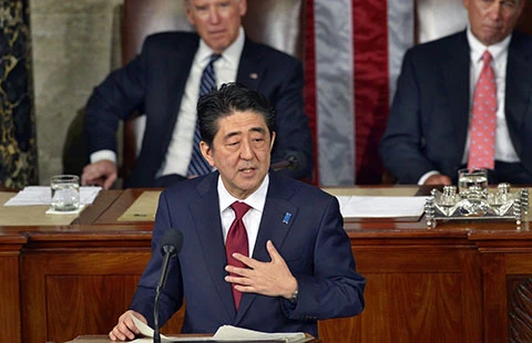 Thủ tướng Nhật Shinzo Abe phát biểu trước Quốc hội Mỹ hôm 29-4. Ảnh: WASHINGTON POST