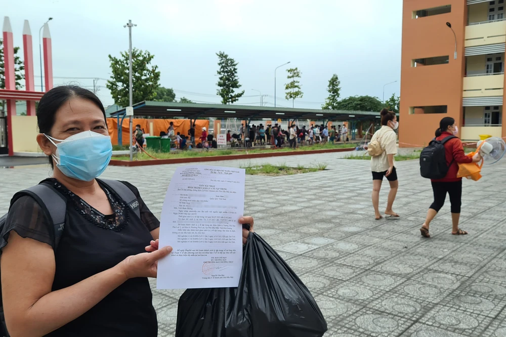 Cầm tờ giấy xác nhận hoàn thành thời gian cách ly, chị M. vui mừng vì mình đã âm tính trở về đoàn tụ với gia đình. Ảnh: LÊ ÁNH
