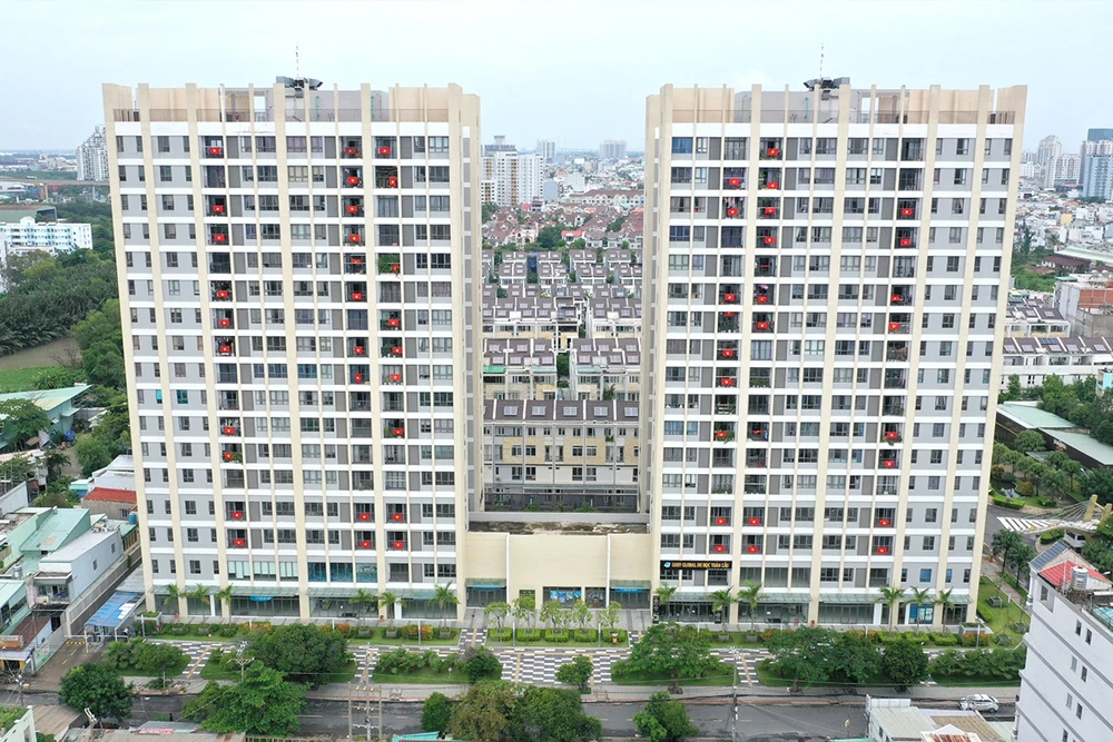 Chung cư treo cờ sau khi nhận tin toàn bộ cư dân có kết quả âm tính.