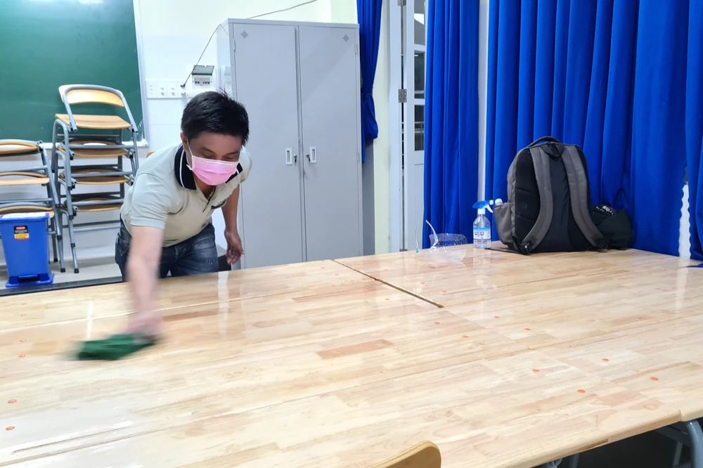 Những chiếc bàn học sinh được xếp vào với nhau thành chiếc giường dã chiến, là chỗ ngủ trong suốt thời gian cách ly.