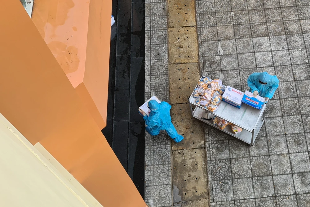 8 giờ, xe đồ ăn được hai nhân viên đẩy đến từng khu cách ly, để phân phát đồ ăn. Một nhân viên vừa đẩy xe đồ ăn vừa cầm loa thông báo: “Mỗi phòng cử một người đại diện xuống lấy đồ ăn sáng”.
