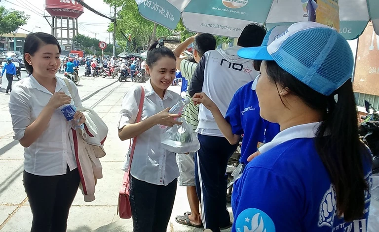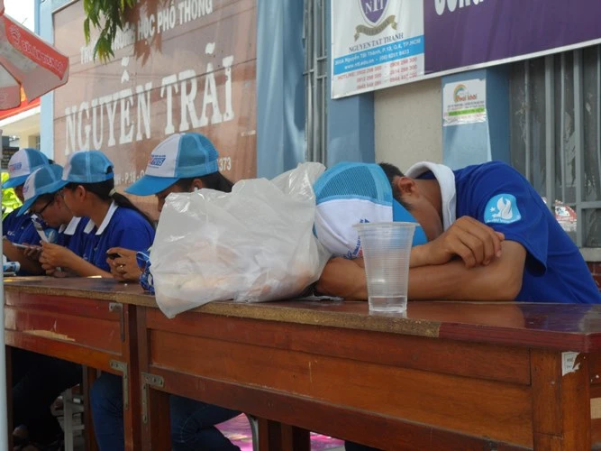 Nguyễn Thị Thanh Thủy (Sinh viên năm nhất, Đại học Sài Gòn) là một ví dụ. Gần tuần nay, Thủy phải dậy từ 4h sáng, chuẩn bị để bắt chuyến xe đầu tiên lúc 4h45. Nhà Thủy ở quận 9, để đến điểm thi này Thủy phải bắt hai tuyến xe buýt mới đến nơi. “Lúc ngồi trên xe em tranh thủ ngủ thêm một tí. Tình nguyện là không nề hà. Chúng em hi vọng một chút việc nhỏ của mình có thể giúp các sĩ tử và phụ huynh yên tâm tập trung hoàn thành tốt kì thi bước ngoặt này”.