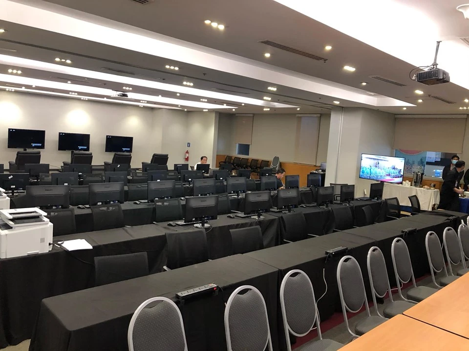 Trung tâm báo chí với những chiếc máy tính mới tinh chưa ai sử dụng và trong tầm mắt phóng viên là một số màn hình tivi sẽ trực tiếp các môn thi đấu SEA Games 30.