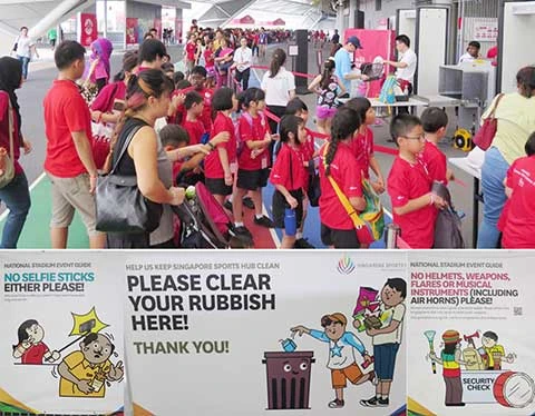 Trẻ em Singapore xếp hàng ngay ngắn vào sân vận động và những áp phích ngộ nghĩnh nhắc nhở mọi người những điều cấm kỵ hoặc nên làm khi vào sân cổ vũ. Ảnh: CT