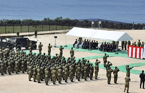 Báo Asahi Shimbun (Nhật) đưa tin cùng ngày, lực lượng phòng vệ Nhật đã làm lễ ra mắt căn cứ mới với 160 quân bố trí trên đảo Yonaguni.