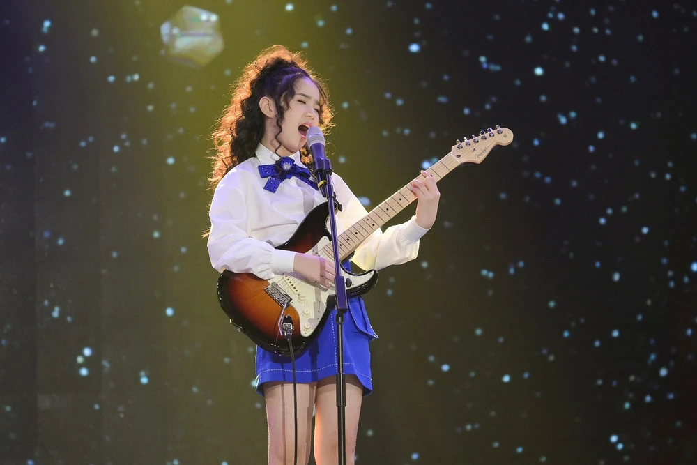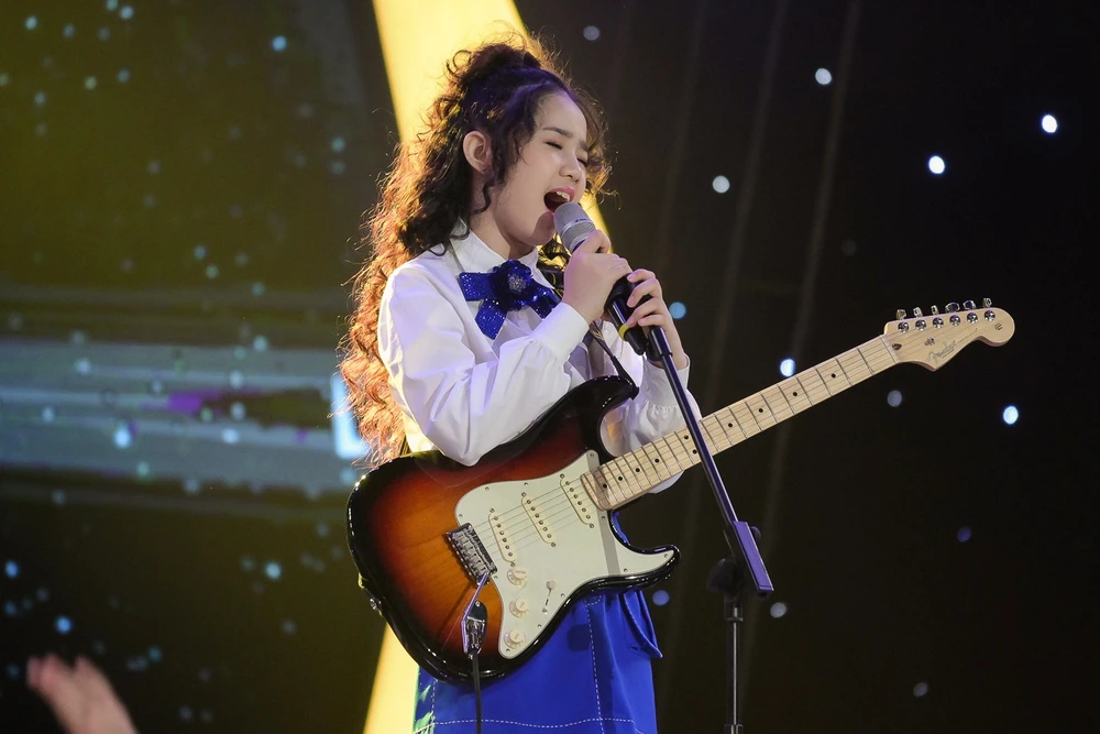 Cô bé Hoàng Thiên Nga chọn cho mình ca khúc Áo xanh, em khiến mọi người bất ngờ khi khoe kỹ năng guitar lead cực ngầu.