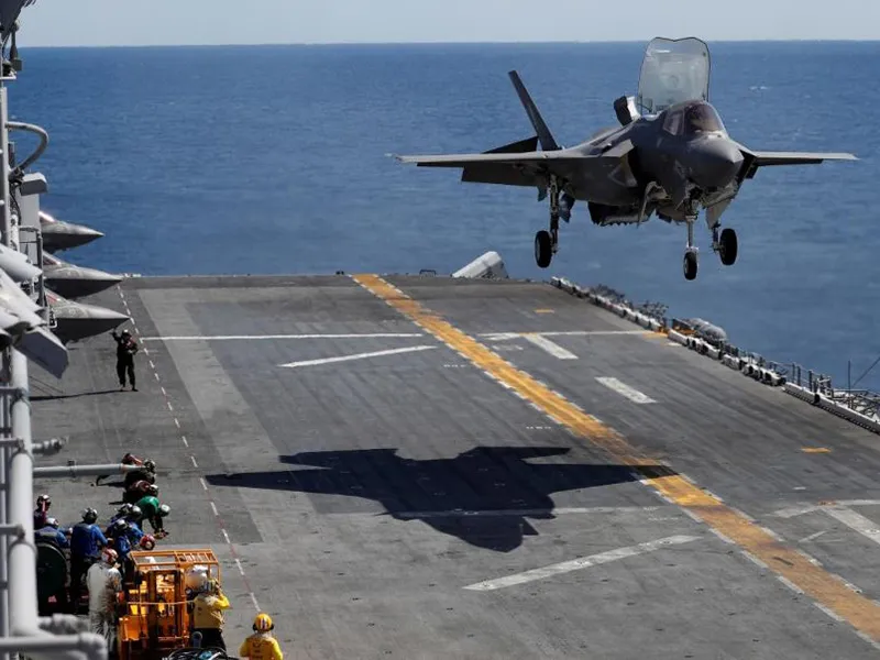 Một chiếc F-35B chuẩn bị hạ cánh thẳng đứng xuống tàu sân bay đổ bộ USS Wasp của Mỹ trên vùng biển ngoài khơi đảo Okinawa (Nhật). Ảnh: REUTERS