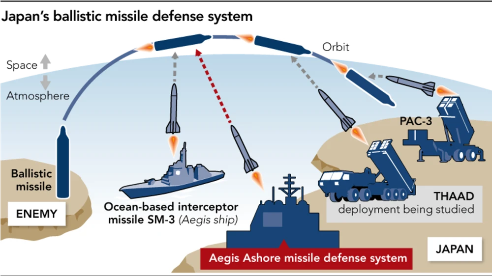 Vào cuối tháng 6, Bộ trưởng Quốc phòng Nhật Bản Taro Kono đã thông báo huỷ kế hoạch lắp đặt hệ thống đánh chặn tên lửa Aegis Ashore tại hai tỉnh Akita và Gamaguchi.