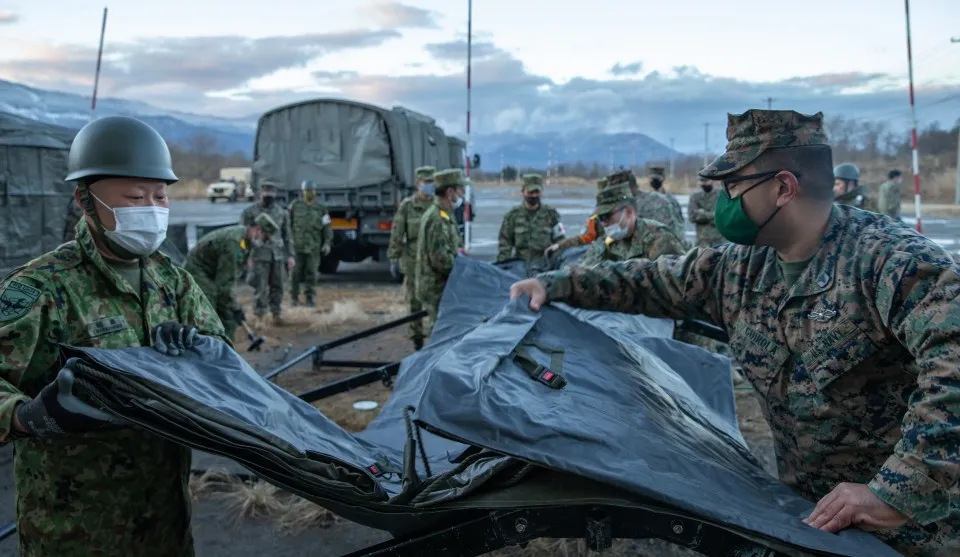 Lực lượng Phòng vệ Mặt đất của Nhật Bản và Thủy quân lục chiến Mỹ. Ảnh: KYODO