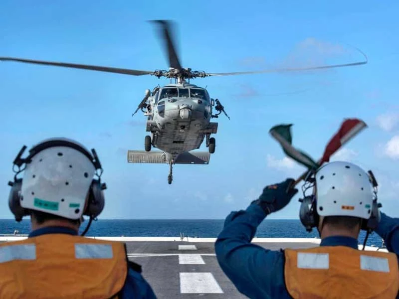 Máy bay trực thăng MH-60S Sea Hawk cất cánh từ tàu sân bay JS Izumo của Nhật trên biển Đông ngày 14-6-2017. Ảnh: HẢI QUÂN Mỹ
