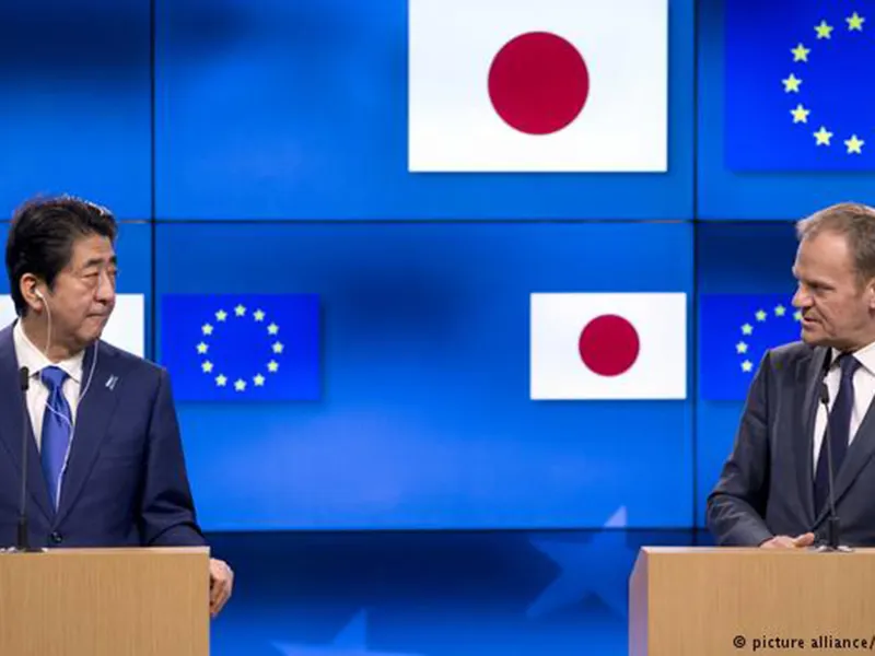 Phát biểu tại hôm ký kết hiệp định, cùng với Chủ tịch Hội đồng châu Âu Donald Tusk và Chủ tịch Ủy ban châu Âu Jean-Claude Juncker, ông Abe đã khẳng định: “Liên minh châu Âu và Nhật Bản có cùng một quyết tâm vững chắc để dẫn dắt thế giới dưới lá cờ tự do thương mại”.