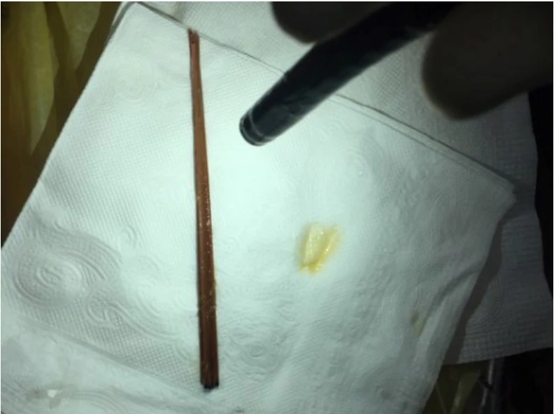 Tại đây, ông T. được các bác sĩ (BS) tiến hành gắp sáu cây nhang dài khoảng 15 cm qua đường nội soi. Tuy nhiên, các BS không phát hiện khối cẩm thạch.