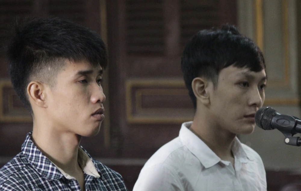Hai bị cáo Trung Hiếu (áo trắng) và Thành Đạt đang nghe tòa tuyên án.