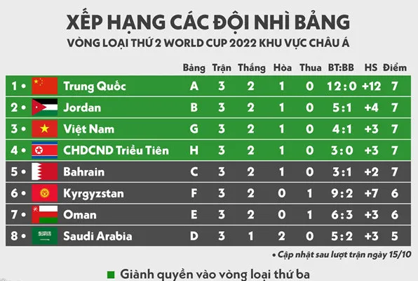 Đội tuyển Việt Nam tạm xếp thứ ba trong số bốn đội nhì bảng có thành tích tốt nhất.