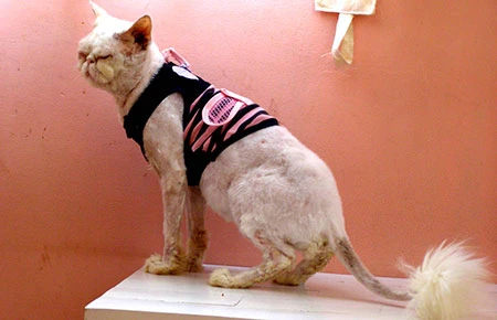 Một chú mèo bị cạo sạch lông do nhiễm nấm da. Ảnh: TRẦN NGỌC
