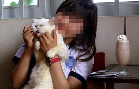 Một bạn trẻ ôm ấp mèo, bên cạnh là ly kem không có nắp đậy. Ảnh: TRẦN NGỌC