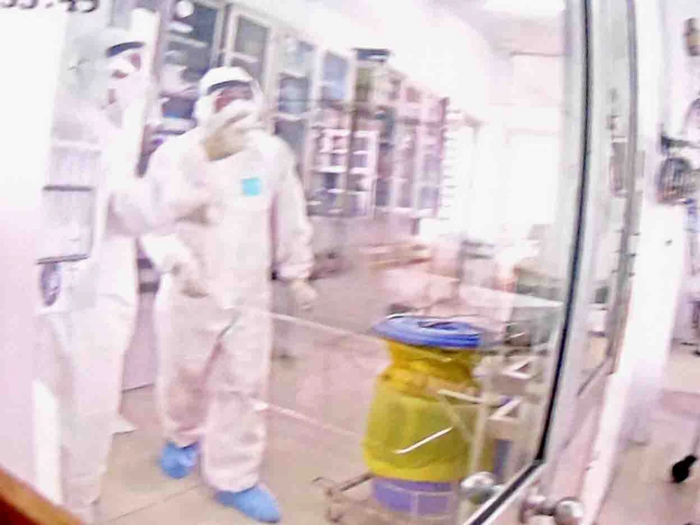 Nhân viên y tế vào phòng cách ly bệnh nhân nhiễm virus Corona lấy bệnh phẩm xét nghiệm. (Ảnh chụp qua màn hình)