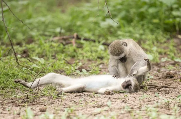 Sau khi "hô hấp nhân tạo", con khỉ đực quay ra chải lông cho con cái. Ảnh: WILLIAM STELL/MIRROR