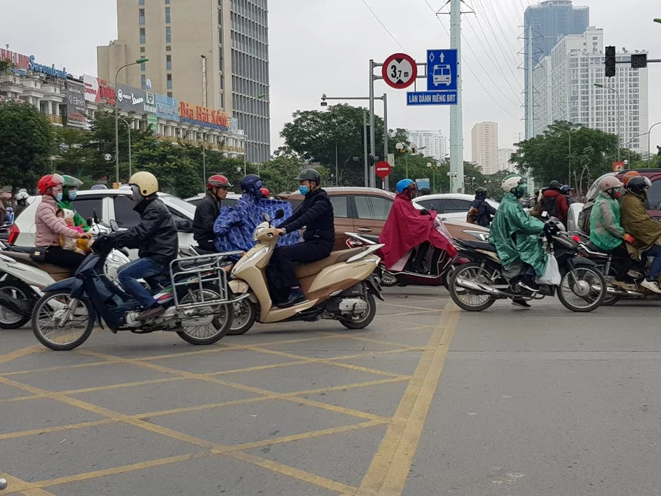 Nhiệt độ giảm mạnh, nhiều người dân ra đường phải mặc áo mưa dù trời không mưa. Ảnh: AN HIỀN