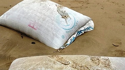 Bao tải chứa chất lạ trôi dạt vào bờ biển Thanh Hóa. Ảnh: ĐT