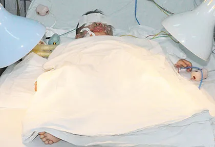 Bé TH (ba tuổi, ở Đồng Nai) bị đuối nước. Do bị bỏ vào lu… hơ lửa nên bé bị bỏng nặng, gương mặt biến dạng. Bé đang được chăm sóc tại BV Nhi đồng Đồng Nai. Ảnh: HOÀI AN