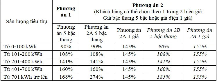 Nếu phương án 1 được áp dụng thì biểu giá điện cho khách hàng sẽ có 5 bậc giảm 1 bậc so với biểu giá điện hiện hành. Nếu phương án 2A hoặc 2B áp dụng, khách hàng sẽ có quyền lựa chọn áp dụng giá điện bậc thang hoặc biểu giá một giá phù hợp với thực tế sử dụng điện của gia đình. Sau 12 tháng, khách hàng có thể tiếp tục áp dụng giá điện đang áp dụng hoặc đổi sang biểu giá khác.