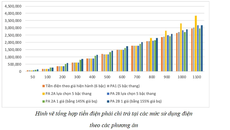Phân tích cụ thể từng phương án đề xuất đưa ra trong dự thảo, Bộ Công Thương cho hay, với các phương án 1, phương án 2A, 2B thì các khách hàng sử dụng điện trung bình hàng tháng dưới 700 kWh (chiếm trên tỉ lệ trên 98% tổng số khách hàng) có chi phí trả tiền điện bằng nhau do giá 4 bậc thang đầu của các phương án giống nhau.