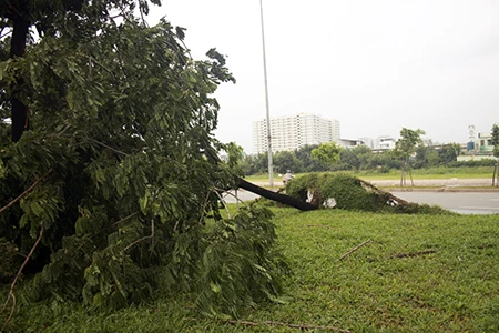 Theo đó, mưa lốc khá lớn đã khiến gần chục cây xanh trên đại lộ Võ Văn Kiệt đoạn giao giữa Hồ Ngọc Lãm đến An Dương Vương (trên địa bàn Q. Bình Tân, TP.HCM) bị bật gốc, đổ ngã.