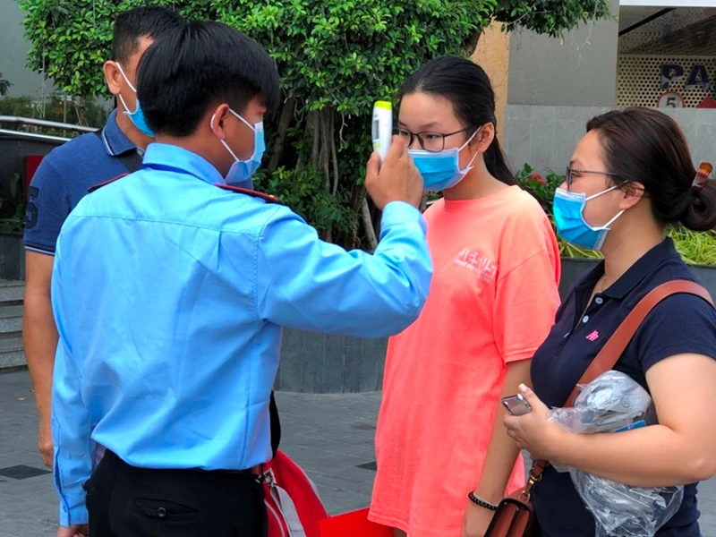Bảo vệ chung cư Jamila Khang Điền (quận 9, TP.HCM) đo thân nhiệt cho cư dân đảm bảo phòng, chống dịch Corona. Ảnh: THU TRINH