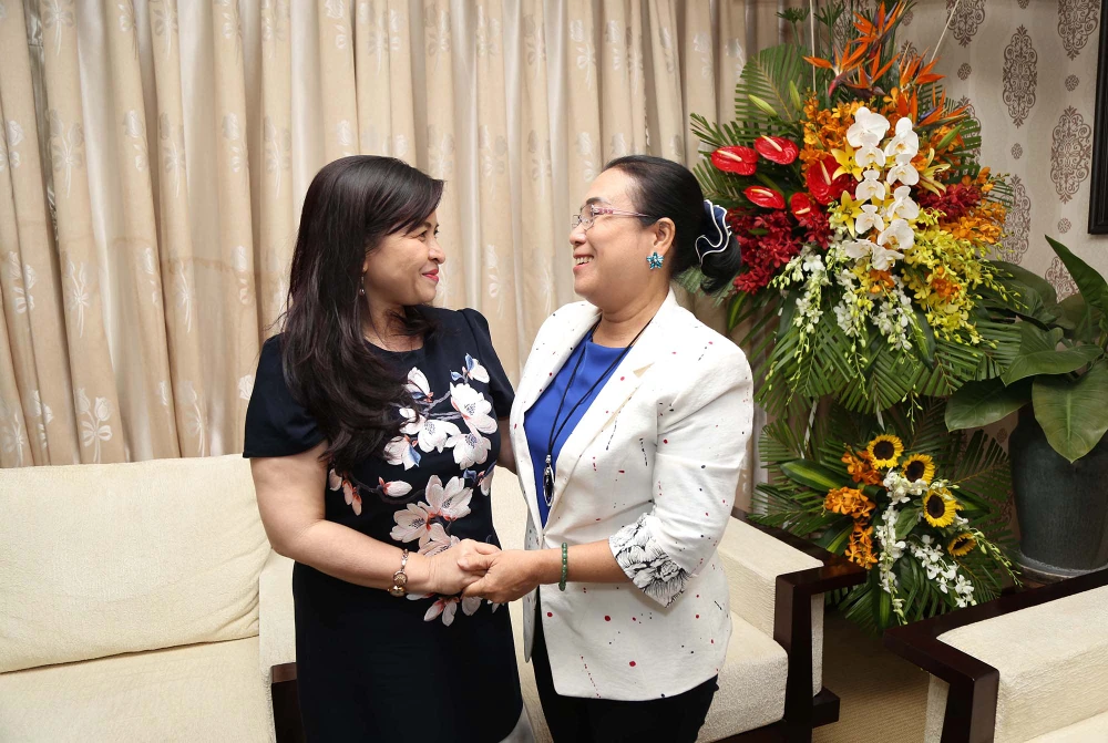 Bác sĩ Đỗ Thị Ngọc Diệp - Giám đốc Trung tâm Dinh dưỡng TP.HCM (trái) thăm và chúc mừng báo Pháp Luật TP.HCM. Ảnh: HOÀNG GIANG