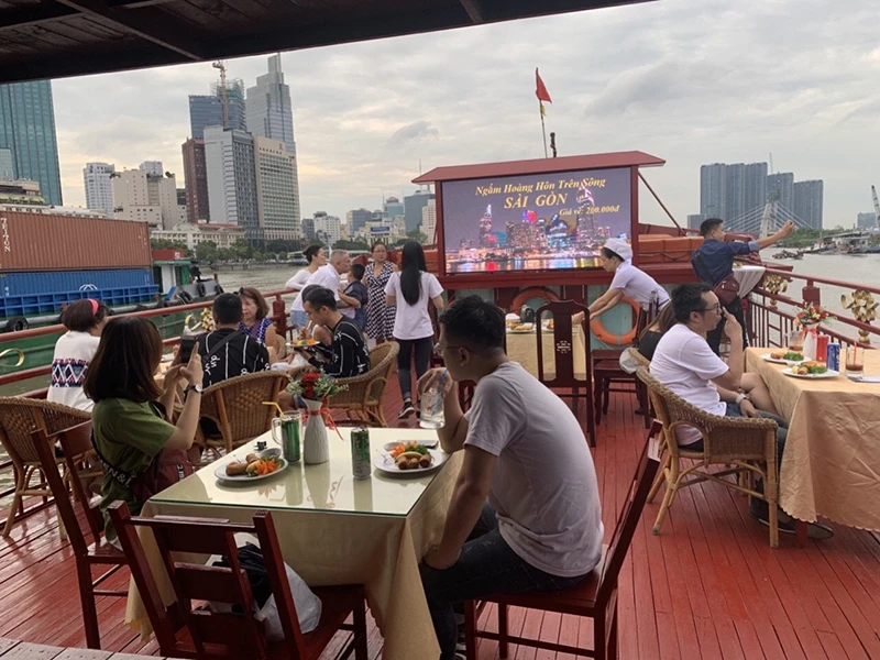 Vì dịch COVID-19, ngành du lịch giảm mạnh cả về doanh thu lẫn lượng khách. Trong ảnh: Du khách tham quan ngắm hoàng hôn trên sông Sài Gòn bằng du thuyền. Ảnh: TÚ UYÊN