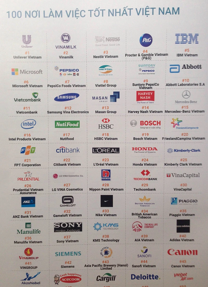 Theo đó Unilever tiếp tục được bình chọn là nơi làm việc tốt nhất Việt Nam. các vị trí kế tiếp là Vinamilk, Nestle Vietnam, Procter&Gamble Vietnam (P&G), IBM Vietnam, Microsoft, Pesico, Viettel...