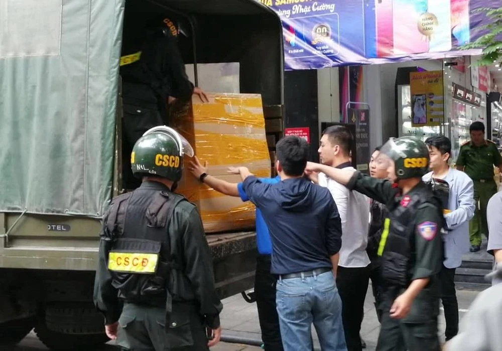 Cảnh sát thu giữ nhiều tang vật sau khi khám xét cơ sở của Nhật Cường mobile.