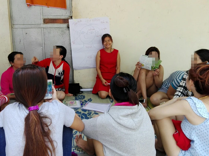 Chị Mộng Linh (giữa, tươi cười) trong một buổi sinh hoạt với các chị trong nhóm Bình minh đêm. Ảnh: H.MINH