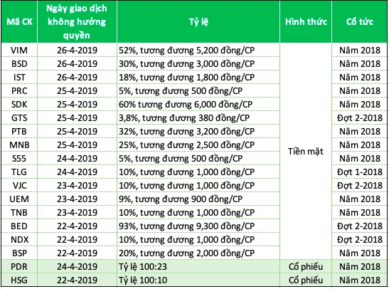 Hình thức chi trả hầu hết các công ty đợt này đều bằng tiền mặt, ngày giao dịch không hưởng quyền trong khoảng từ ngày 22 đến ngày 26-4-2019.