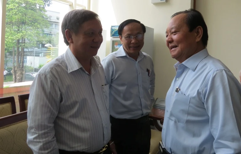 Bí thư Thành ủy TP.HCM Lê Thanh Hải trao đổi với các đại biểu bên lề hội nghị. Ảnh: TÁ LÂM.