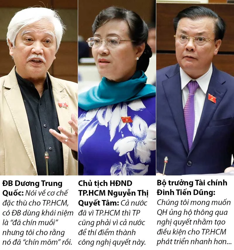 | Thử thách lớn đối với TP TP.HCM có những thành quả và đóng góp ngày càng nhiều cho cả nước, đồng thời nâng cao đời sống cho người dân TP đều do Trung ương, Đảng, Bộ Chính trị, Quốc hội, Chính phủ đã quan tâm, chỉ đạo tháo gỡ nhiều vướng mắc kịp thời để TP phát triển. Thành quả ấy là kết tinh từ sự hy sinh, tính mạng, xương máu của đồng bào, chiến sĩ cả nước. Hiện nay các tỉnh, thành trên cả nước cũng đều hỗ trợ TP.HCM phát triển rất nhiều… Đảng bộ, nhân dân, chiến sĩ TP.HCM luôn cố gắng, ý thức rằng đó không chỉ là sự đóng góp của nhân dân TP mà còn là trách nhiệm, nghĩa tình của TP với cả nước. Nghị quyết này là một thử thách lớn đối với TP.HCM. Cả nước đã vì TP thì TP cũng phải vì cả nước để thí điểm thành công. ĐB NGUYỄN THỊ QUYẾT TÂM, Chủ tịch HĐND TP.HCM Cả nước sẽ được hưởng lợi TP.HCM đã và đang là một trung tâm kinh tế lớn nhất và mang ý nghĩa đầu tàu của cả nước. GDP của TP chiếm 1/5 GDP của cả nước, tốc độ tăng trưởng kinh tế của TP cao gấp 1,6 lần so với tốc độ của cả nước. Số doanh nghiệp hoạt động trên địa bàn của TP chiếm 1/3 tổng số doanh nghiệp trong cả nước. TP có cơ cấu kinh tế hiện đại, 99% là khu vực công nghiệp và dịch vụ. Chúng tôi mong muốn QH ủng hộ thông qua nghị quyết nhằm tạo điều kiện cho TP.HCM phát triển nhanh hơn, hiện đại, đóng góp nhiều hơn vào GDP và thu ngân sách cho cả nước. Khi đó không chỉ TP được lợi mà cả nước nói chung cũng sẽ được hưởng lợi. Ông ĐINH TIẾN DŨNG, Bộ trưởng Bộ Tài chính |