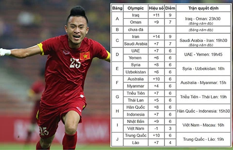 | Cơ hội của U-23 Việt Nam Do điều lệ quy định khi so sánh 10 đội xếp nhì của 10 bảng thì những đội trong bảng có năm đội sẽ không được tính thành tích khi thi đấu với đội cuối bảng. Vì thế mà Oman (đang nhì bảng A) và Saudi Arabia (đang nhì bảng C) sẽ còn phải trừ đi trận thắng đội cuối bảng. Với các bảng còn lại (bảng bốn đội), Việt Nam là đội duy nhất đã chạm trán với đội mạnh nhất bảng. Nhìn vào bảng trên ở bảng J, U-23 Lào gần như không thể tìm trận thắng cuối trước U-23 Trung Quốc. Indonesia (bảng H) và Thái Lan (bảng G) và Myanmar (bảng F) nếu đá sòng phẳng sẽ cực khó lấy điểm trước Hàn Quốc, Triều Tiên và Úc. Cơ hội của U-23 Việt Nam chỉ mở ra nếu các bảng còn lại đá sòng phẳng đồng thời thầy trò HLV Miura thực hiện mưa gôn vào lưới Macau. NG.HUY |