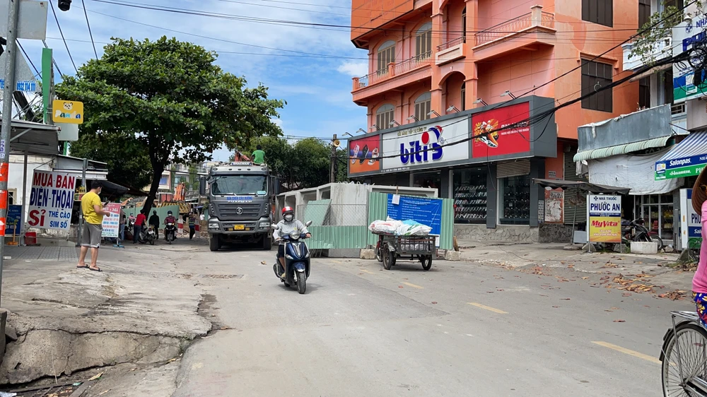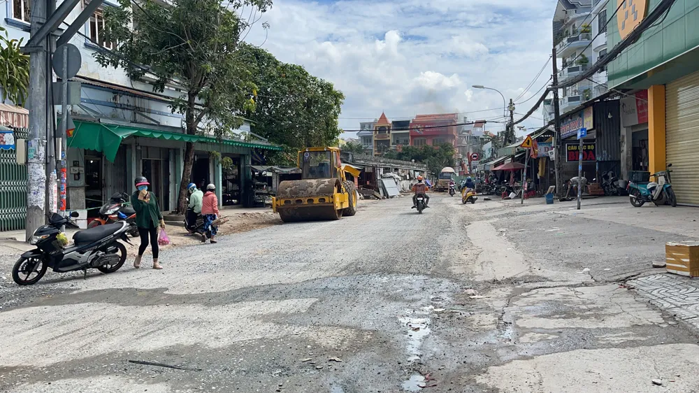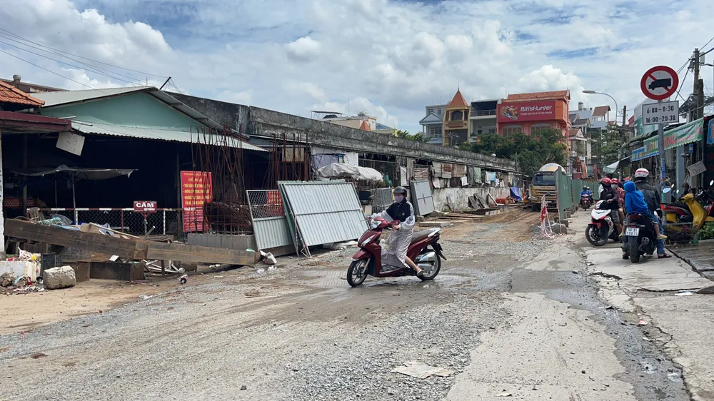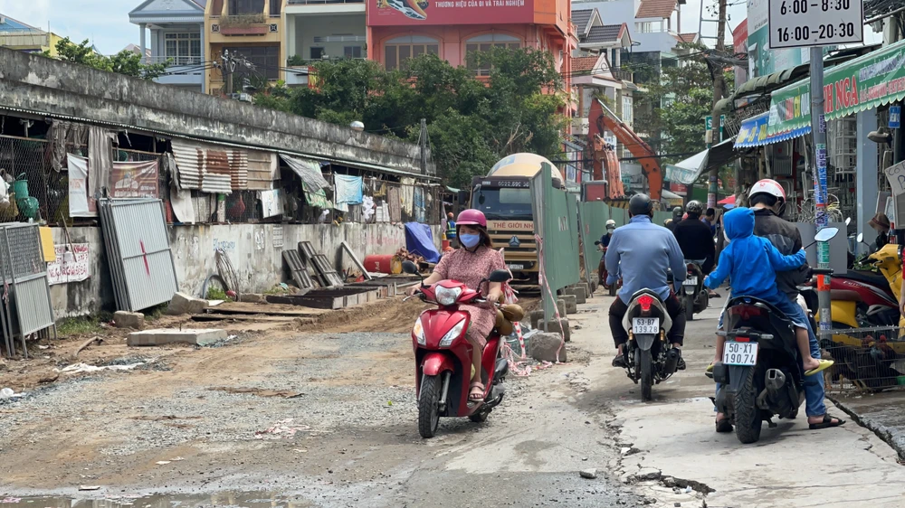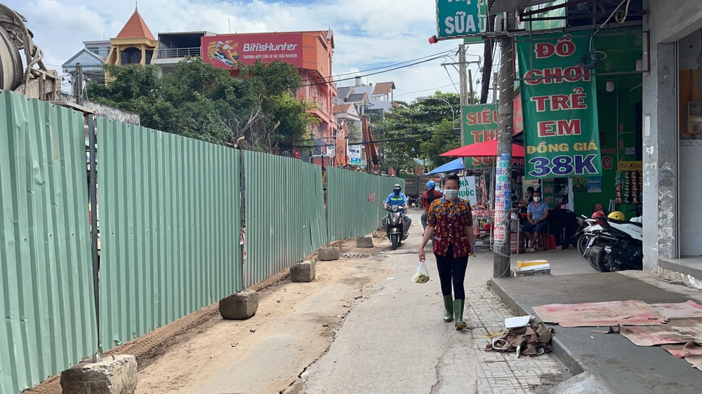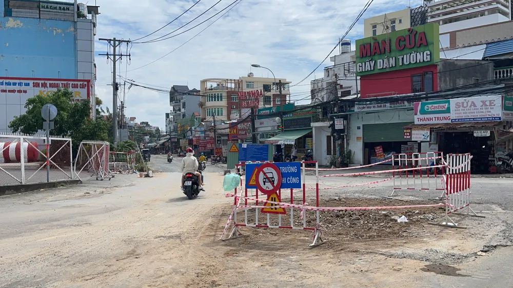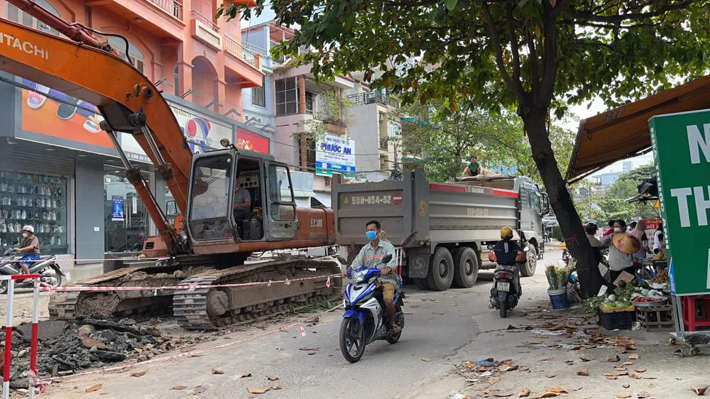 Tại đây, chỉ có người đi bộ, xe máy di chuyển qua đoạn đường đang thi công, xe ô tô phải di chuyển qua lộ trình khác.