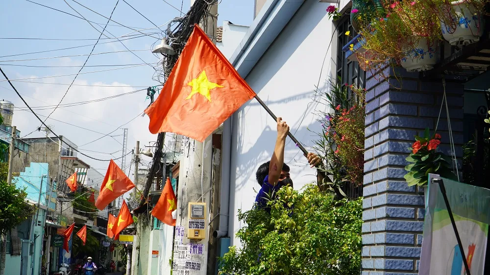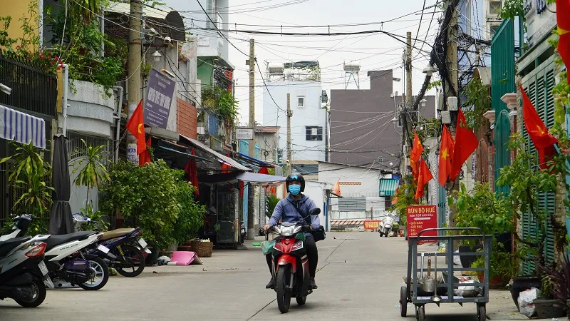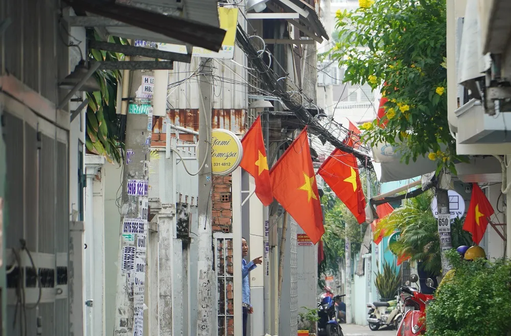 Con hẻm trên đường Lê Lợi (quận Gò Vấp, TP.HCM) lá cờ đỏ sao vàng tung bay phấp phới khiến lòng người xôn xao. Ảnh: MINH TÂM