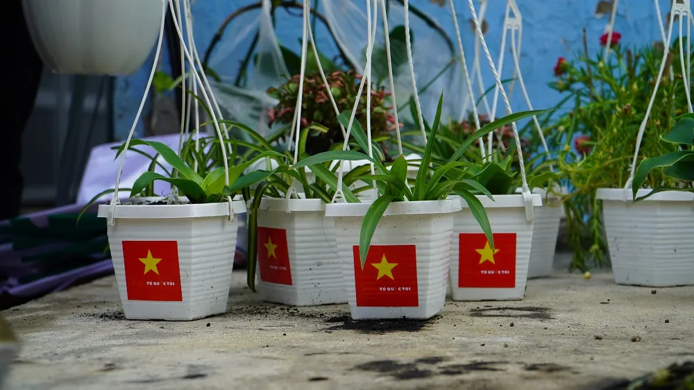 Ngoài việc vận động người dân treo cờ, các bạn trẻ ở Đoàn phường 4, quận Gò Vấp, TP.HCM còn tặng cho các hộ dân những chậu cây xanh dán cờ tổ quốc nhằm kêu gọi người dân hãy 'sống xanh' và thể hiện tình yê với Đất Nước. Ảnh: MINH TÂM