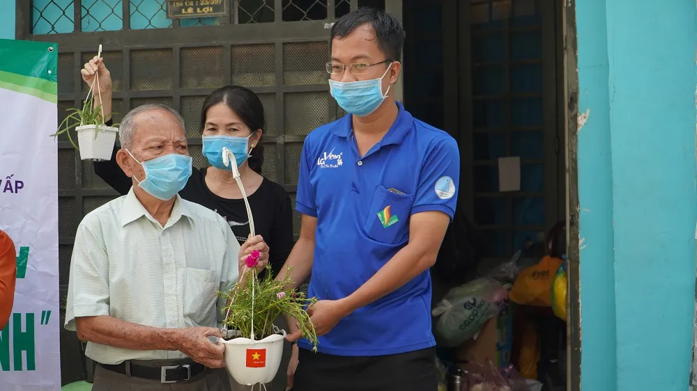 Anh Bùi Minh Tân (Bí thư Đoàn phường 4, quận Gò Vấp) trao tặng chậu cây xanh cho người dân. Ảnh: MINH TÂM
