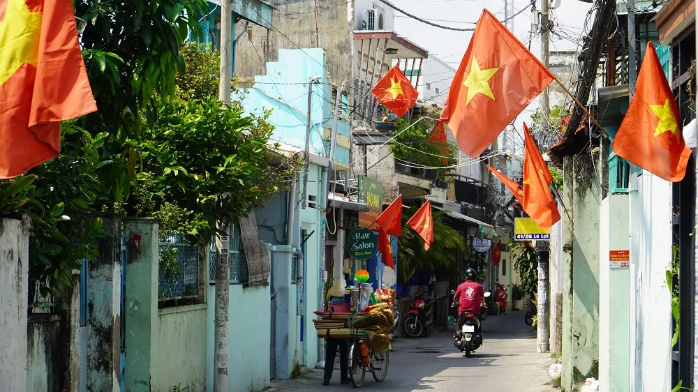 Một con hẻm tại TP.HCM rợp bóng cờ đỏ trước ngày lễ 2-9. Ảnh: MINH TÂM
