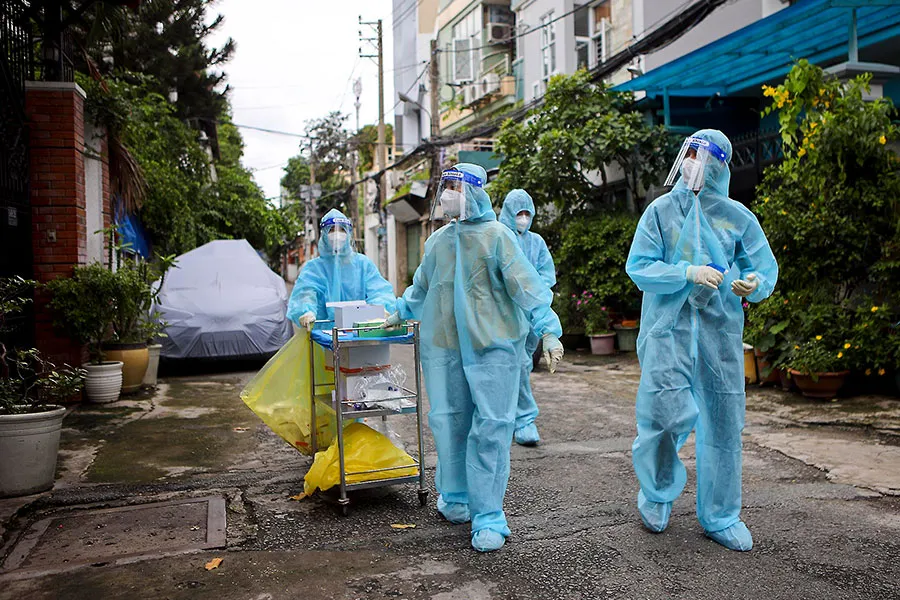 Nhân viên y tế phường 7, quận Tân Bình, TP.HCM đến từng hộ dân trên địa bàn để lấy mẫu xét nghiệm trong đợt dịch COVID-19 lần thứ tư. Ảnh: NGUYỆT NHI